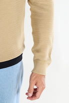 - Tröjan har ribbade kanter vid botten, ärmar och hals.