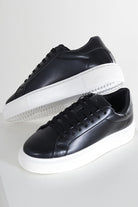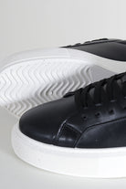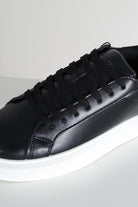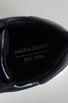 - Svarta läderskor med vit gummisula.