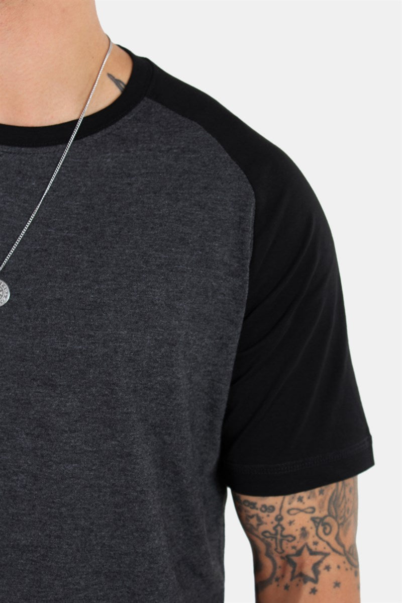 KortärmadT-shirt från Basic i grå antracit med svarta ärmar. Rund hals med svart ribkant. Ärmarna kan vikas upp, de har också svart ribkant. Bra passform och ribkant i botten. 65% Bomull och 35% Polyester. MODELLEN ÄR CA. 1,83 CM, VÄGER CA. 80 KG OCH ANVÄNDER PRODUKTEN I STR. M