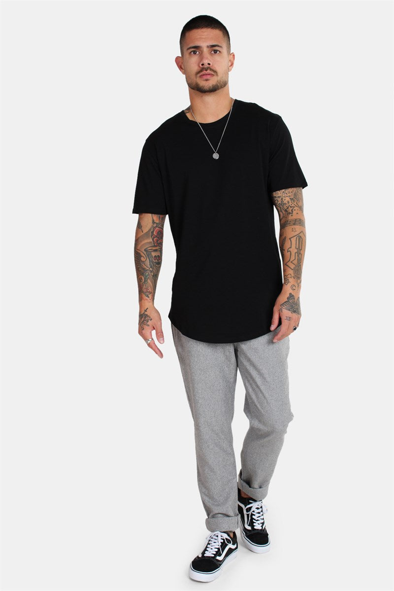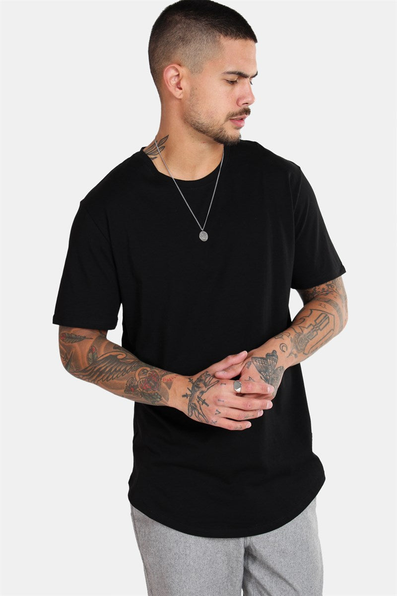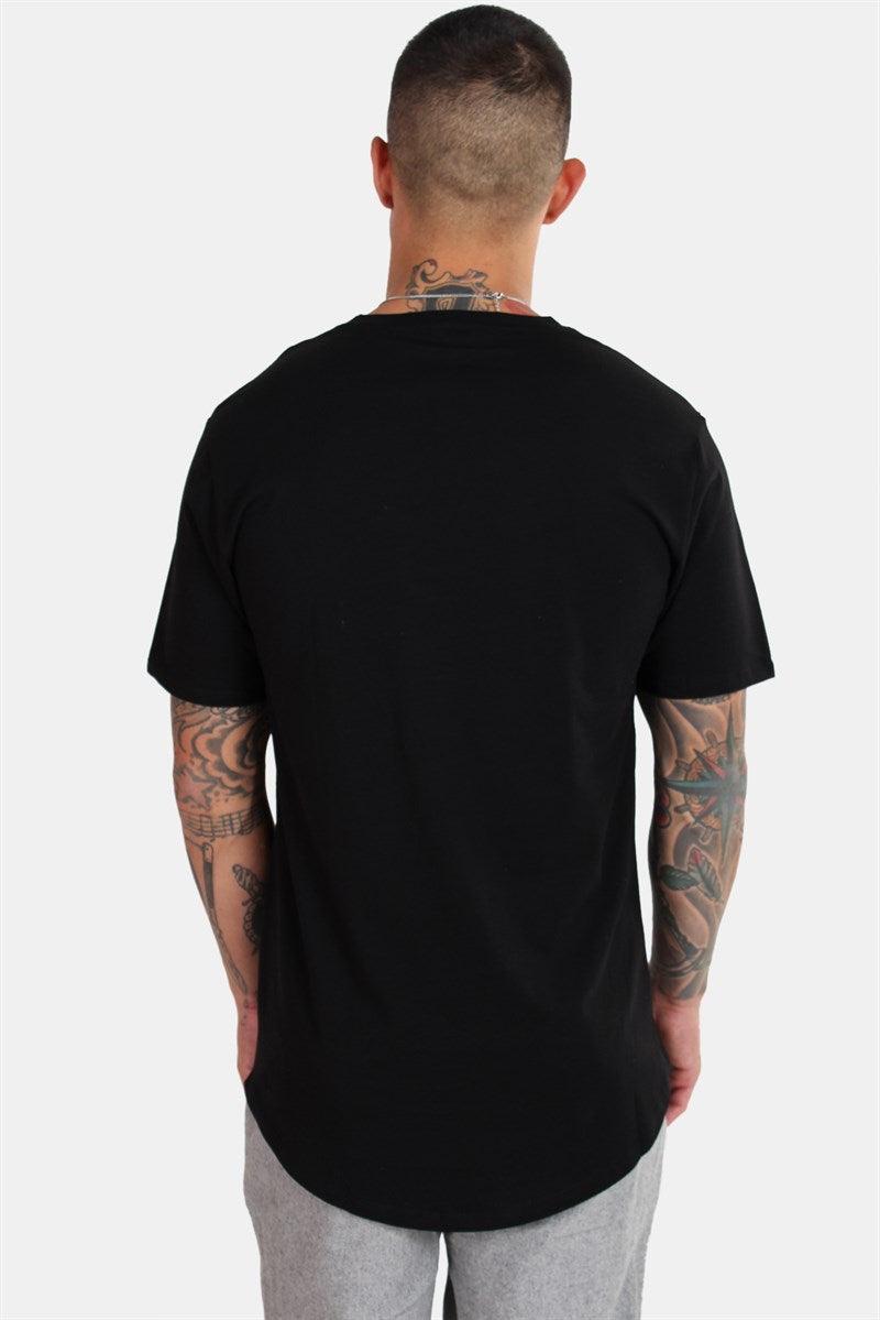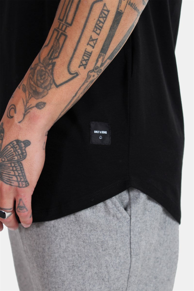Only & Sons T-shirt i svart. Klassisk longline-modell som är en aning rundad i midjan. Rund hals med en smal ribbad mudd. Only & Sons logga längst ned i vänstra sida. Kvalitet: 100% bomull.