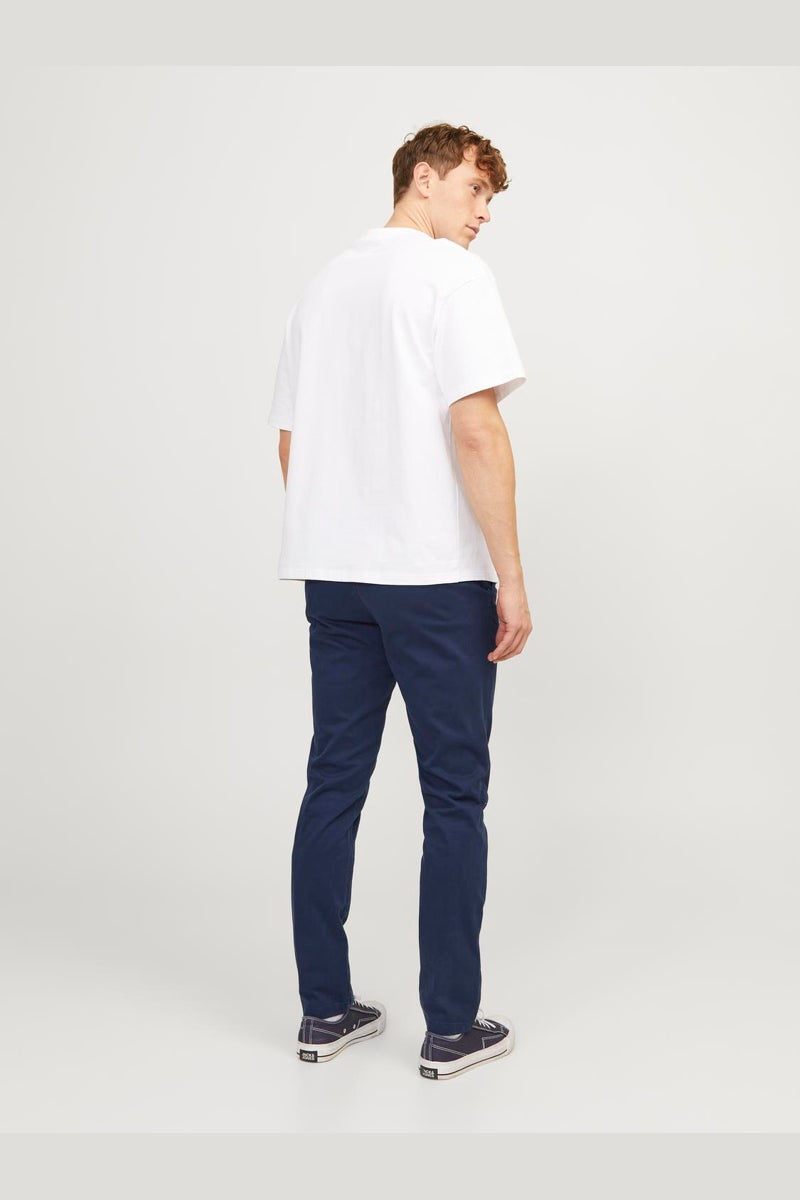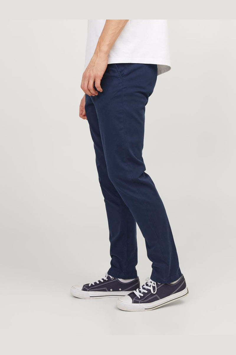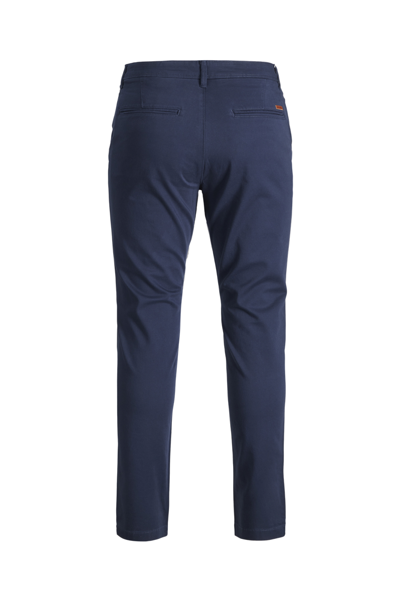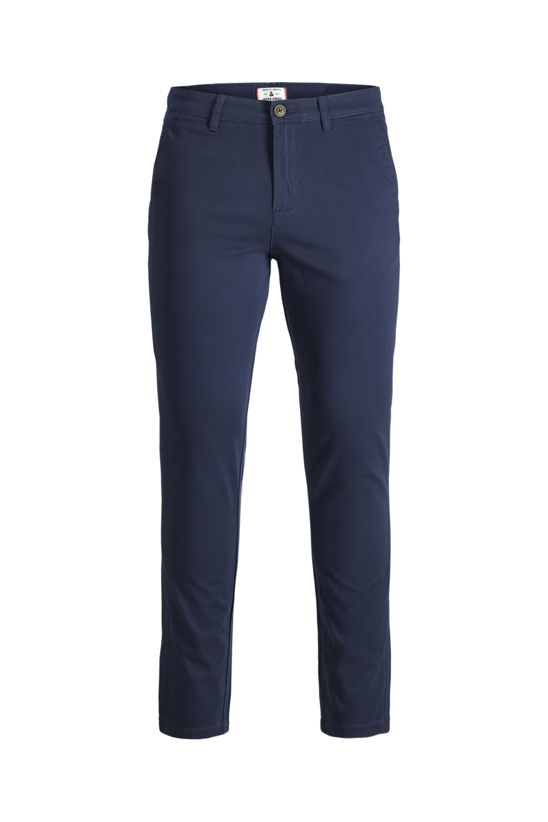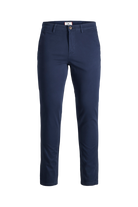 Slim fit chinos från Jack & Jones. Byxorna kommer här i en mörkblå utgåva. 5-pocket modell med 2 skrå framfickor samt två bakfickor och en myntficka. Spänns med blixtlås och topp knapp. Kvalité: 98% bomull 2 % elastan.