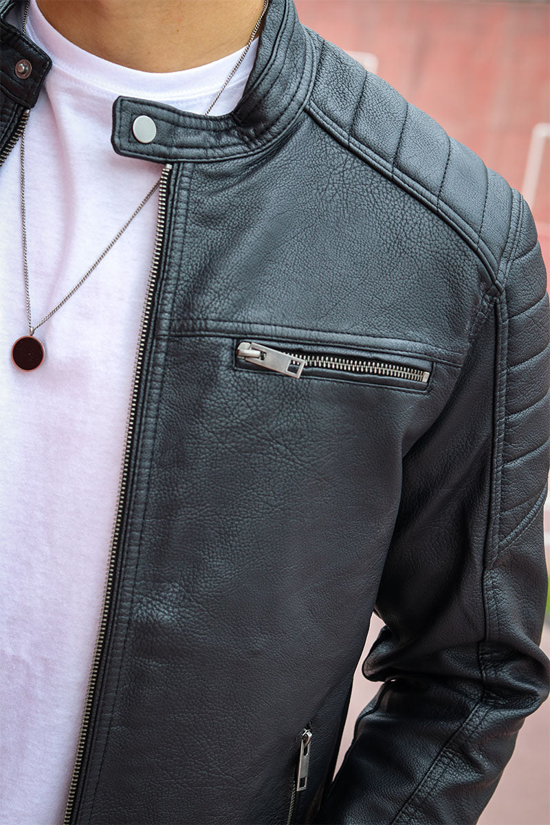 Denna bikerjacka kombinerar en tidlös stil med funktionella detaljer för vardagsbruk. Jackan har en klassisk bikerkrage och långärmade ärmar, med en genomgående dragkedja som stänger plagget tryggt. Det är en quiltad detalj som ger ett extra lager av både komfort och design. Materialet är 100% polyester med en polyuretanbeläggning, vilket ger en tålig yta som samtidigt känns bekväm.