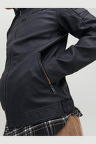 Denna bikerjacka kombinerar en tidlös stil med funktionella detaljer för vardagsbruk. Jackan har en klassisk bikerkrage och långärmade ärmar, med en genomgående dragkedja som stänger plagget tryggt. Det är en quiltad detalj som ger ett extra lager av både komfort och design. Materialet är 100% polyester med en polyuretanbeläggning, vilket ger en tålig yta som samtidigt känns bekväm.