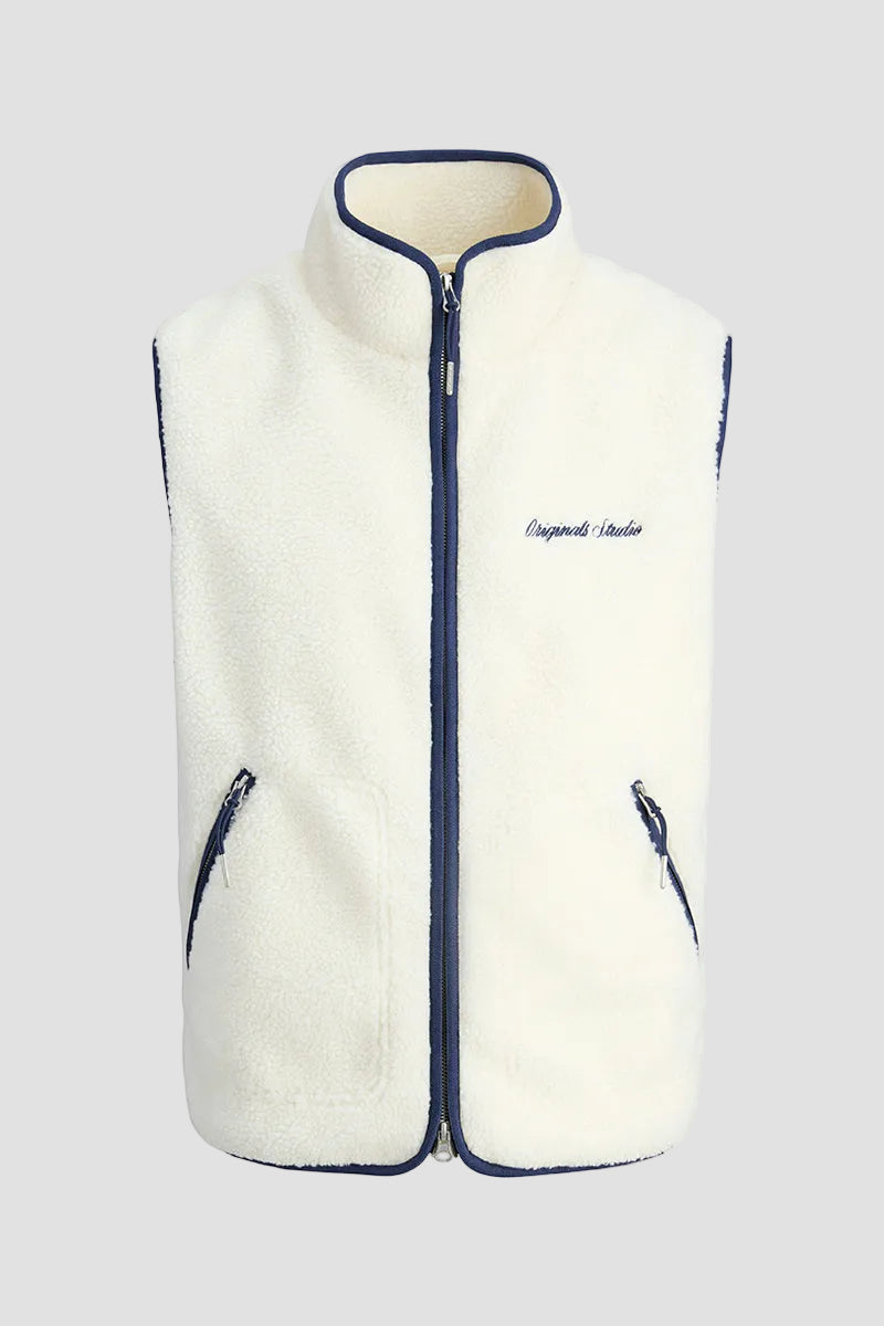 - Västen har hög hals samt dragkedja framtill och vid fickorna
