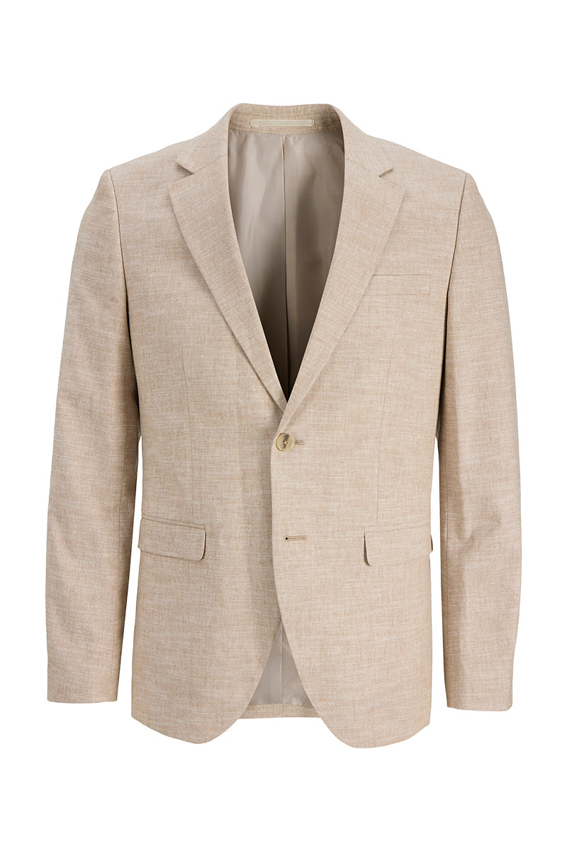 Den här slim fit-blazern är ett stilrent val för formella tillfällen när klädkoden kräver en uppgraderad outfit. Blazern har en klassisk notch-krage och knäppning med knappar fram, vilket ger en tidlös och elegant känsla. Den är helt fodrad och har en innerficka för praktisk förvaring. Materialet består av en vävd blandning av bomull, linne och elastan som ger både hållbarhet och viss stretch för komfort, samtidigt som plagget behåller sin form.