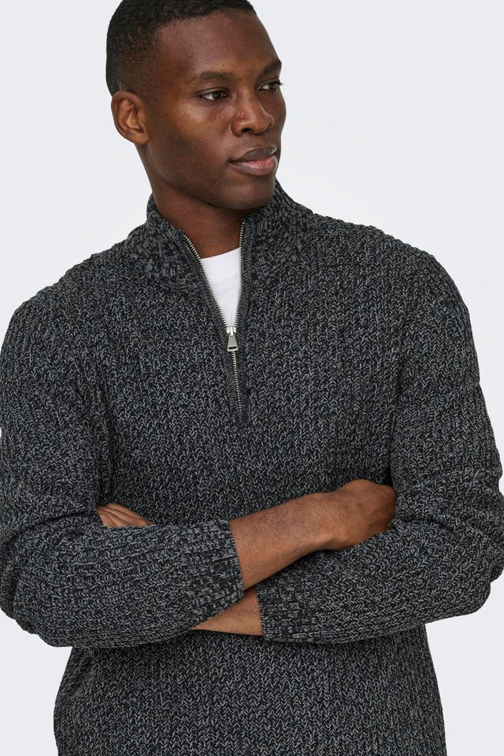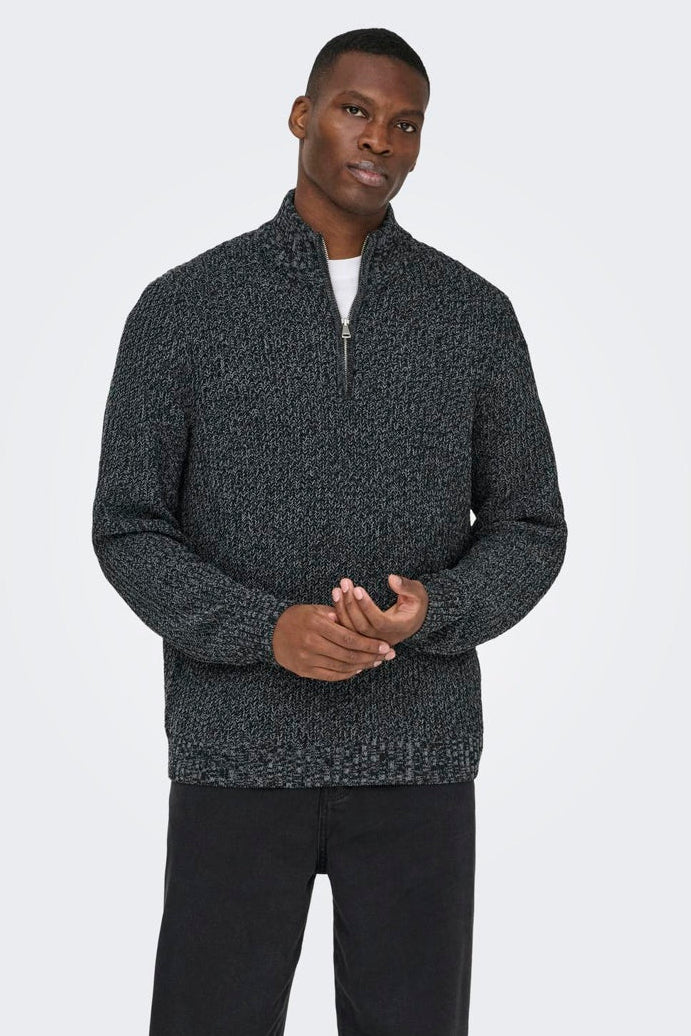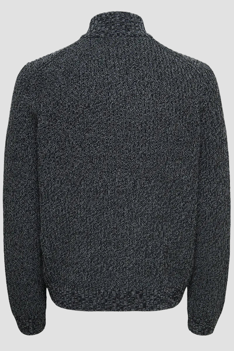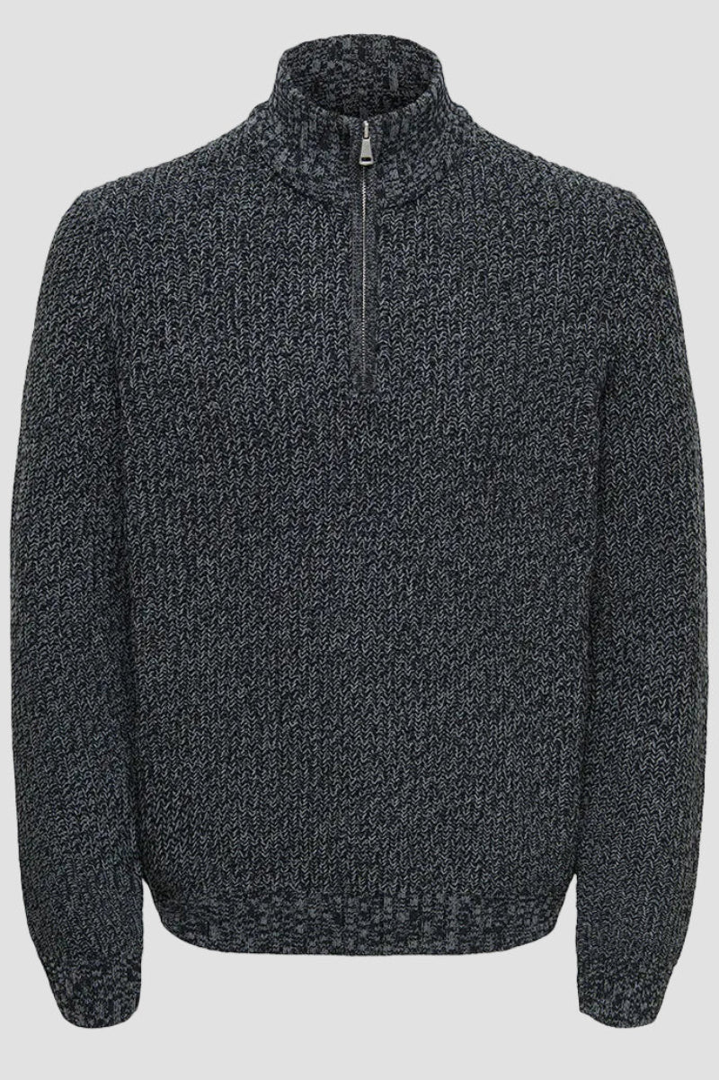 Den här regntröjan med hög hals kombinerar funktion och stil för kyligare dagar. Den långärmade tröjan har en halvt dold dragkedja framtill och en bekväm normal passform som gör den enkel att bära i alla lägen. Materialet består till hälften av återvunnen polyester, vilket bidrar till en mer hållbar garderob samtidigt som det erbjuder en mjuk och behaglig känsla mot huden. Den är stickad med en strukturerad teknik som skapar en modern och ren look. Perfekt för vintern eller svala kvällar när du vill ha både värme och komfort.
