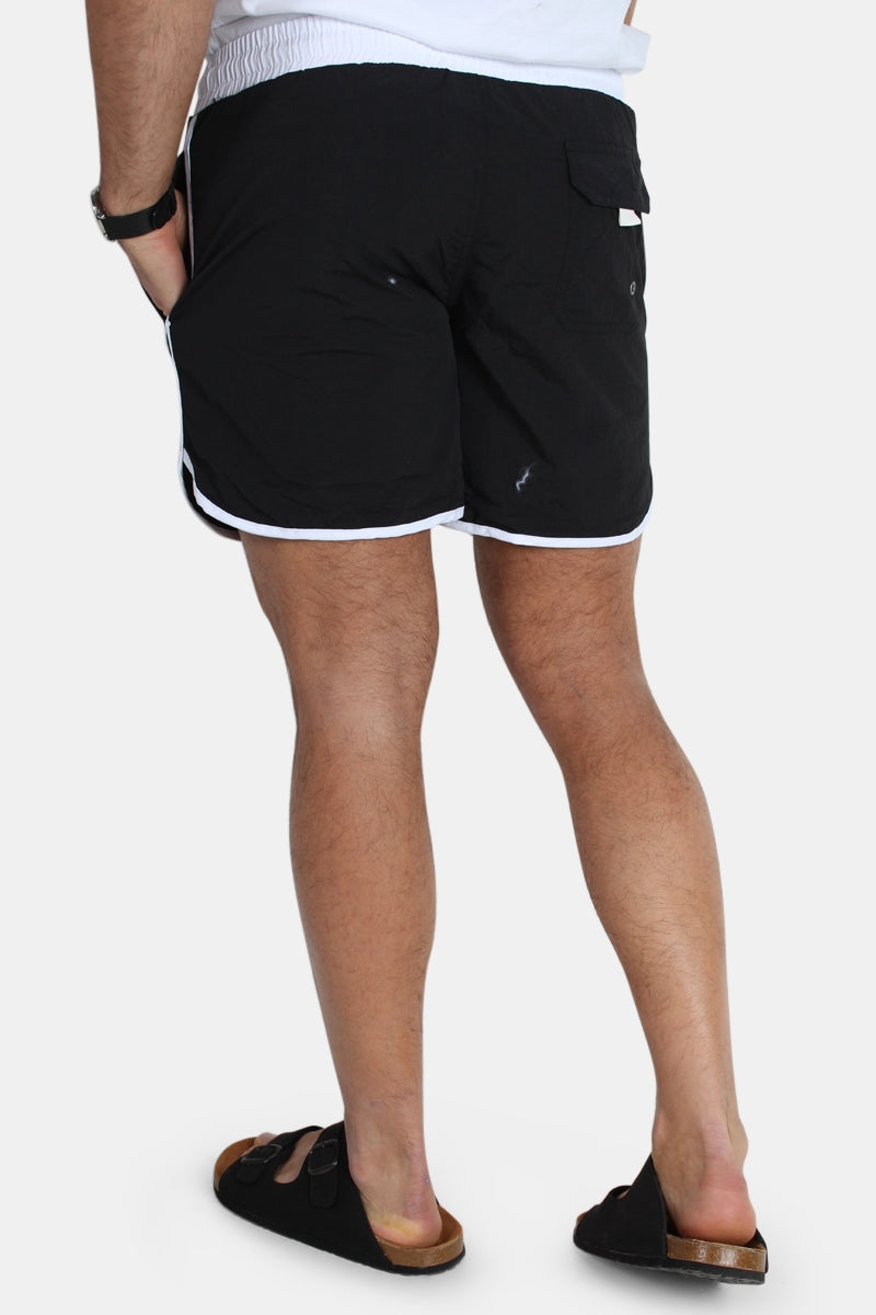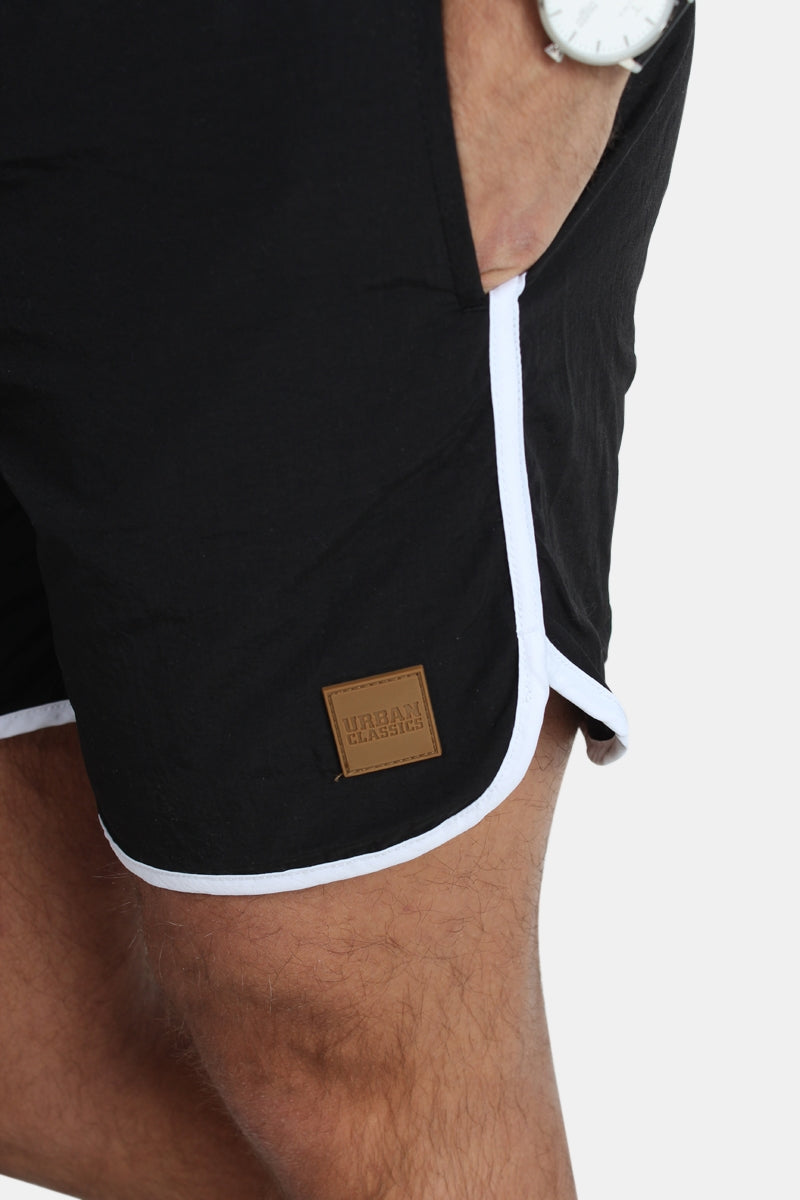 Badshorts från Urban Classics. Retro badbyxor i svart och vit färg. På vänstra benet är det påsytt ett 'Urban Classics' logo i gummi. Kommer med vita snören och ett invändigt nät. Utstyrd med två framfickor och en bakficka som kan stängas med kardborrband. Kvalité: ytter material: 100% nylon, Foder; 100% polyester.