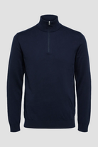 En tidlös och bekväm tröja med halv dragkedja som passar perfekt i vardagsgarderoben. Tröjan har en hög krage och ribbade muddarna i ärmsluten för en skön och stilren passform. Den är stickad med en blandning av bomull och ekologisk bomull, vilket gör den mjuk och hållbar samtidigt som den är ett miljömedvetet val. Med sin mörkblå färg och melange-detalj blir den lätt att matcha med andra plagg för en avslappnad men ändå snygg look.