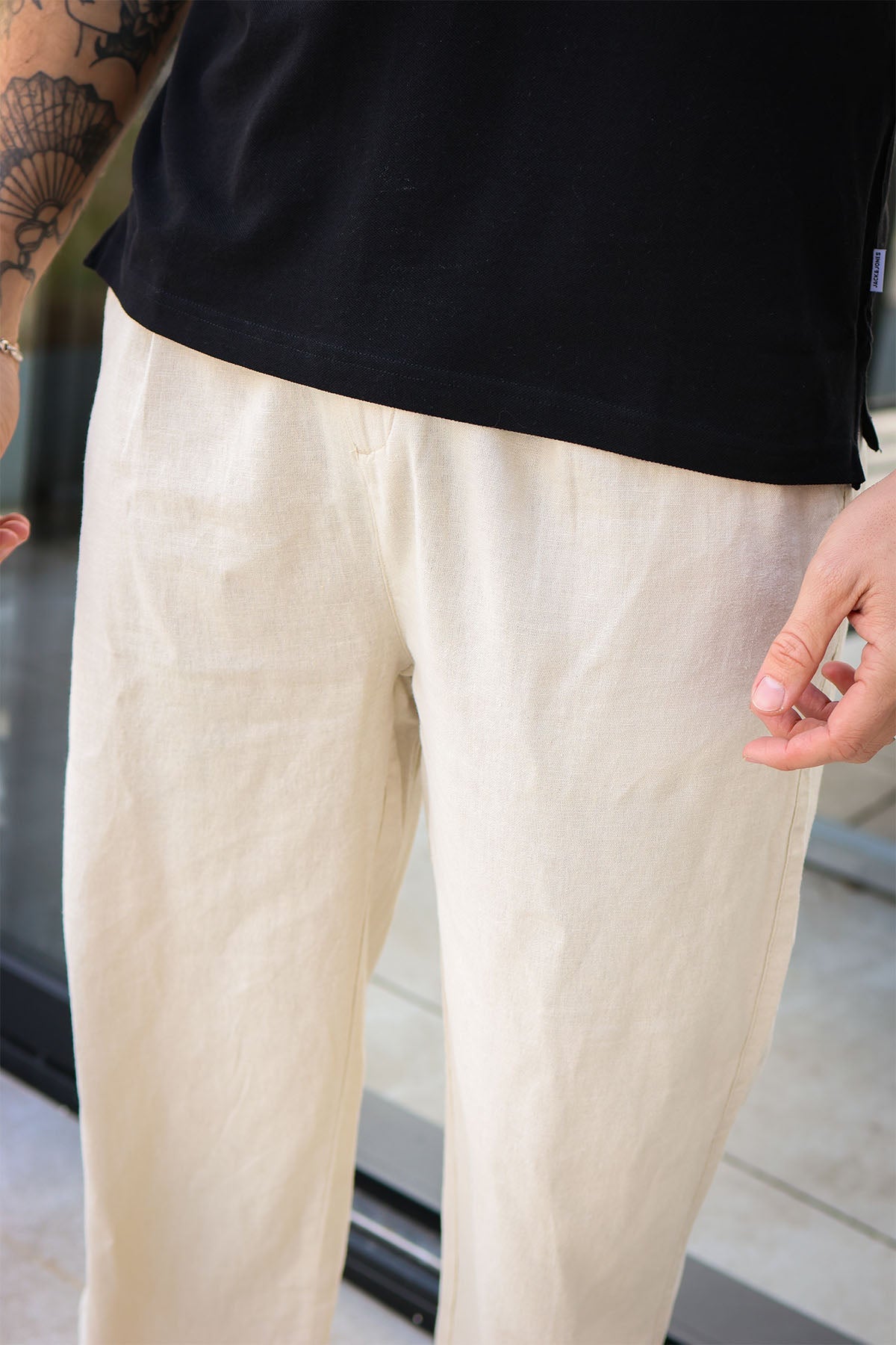 Dessa tapered byxor i en mjuk blandning av linne och viskos erbjuder både stil och komfort för män. Den ljust beige färgen "Oatmeal" ger en naturlig och varm känsla, perfekt för både vardag och mer avslappnade tillfällen. Materialvalet bidrar till en luftig och behaglig känsla under hela dagen.