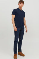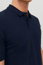 Denna klassiska polo i navy blå färg är tillverkad av 100% ekologisk bomull som både känns bekväm och har en mjuk struktur. Modellen har korta ärmar och en slimmad passform som ger en modern silhuett. Polo-kragen tillsammans med knappstängning fram tillför en tidlös detalj, och det diskreta broderiet ger plagget extra karaktär.