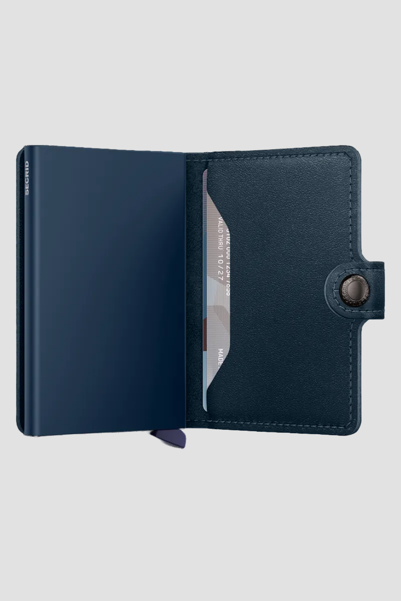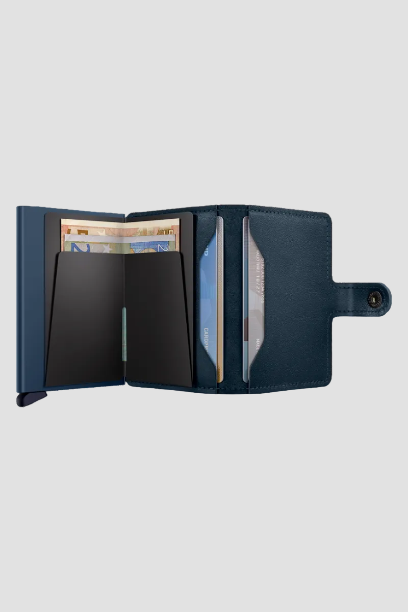 Denna Miniwallet är en kompakt och praktisk plånbok i blått läder som passar vuxna. Dess stilrena design gör den lätt att ta med och användarvänlig för alla tillfällen.
