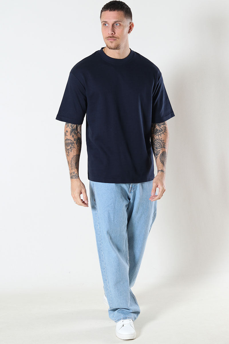 Den tidlösa T-shirten är ett grundläggande plagg i din vardagsgarderob. Den har en lös passform med korta ärmar och en rund halsringning, vilket ger en avslappnad och bekväm känsla hela dagen. Färgen "Sky Captain" är en djup, mörkblå nyans som passar bra med många olika stilar.