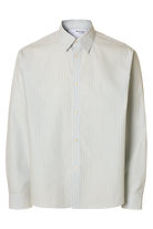 Denna randiga skjorta har en avslappnad boxig passform och lång ärm med knappmanschetter för en klassisk och bekväm stil. Skjortan är designad med en traditionell skjortkrage och knäppning framtill, vilket gör den lämplig för både arbete och särskilda tillfällen. Materialet är huvudsakligen hållbart och innehåller minst 50% ekologisk bomull, vilket bidrar till en mjuk och trivsam känsla mot huden. Den har också en lättstruken finish som gör att plagget är enklare att underhålla och mindre skrynkelfritt.