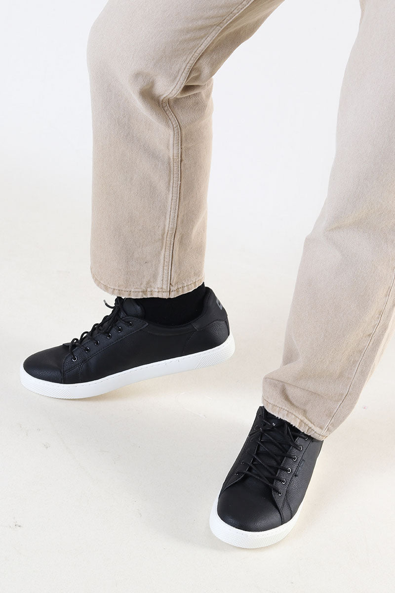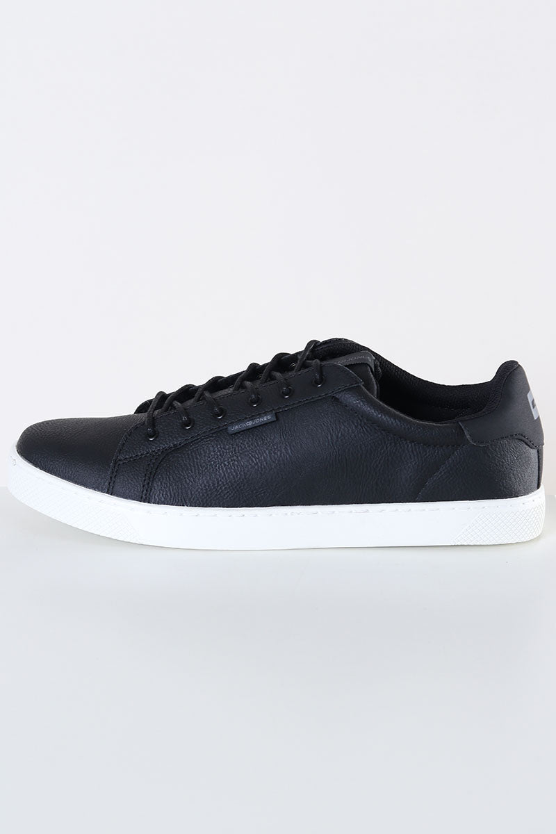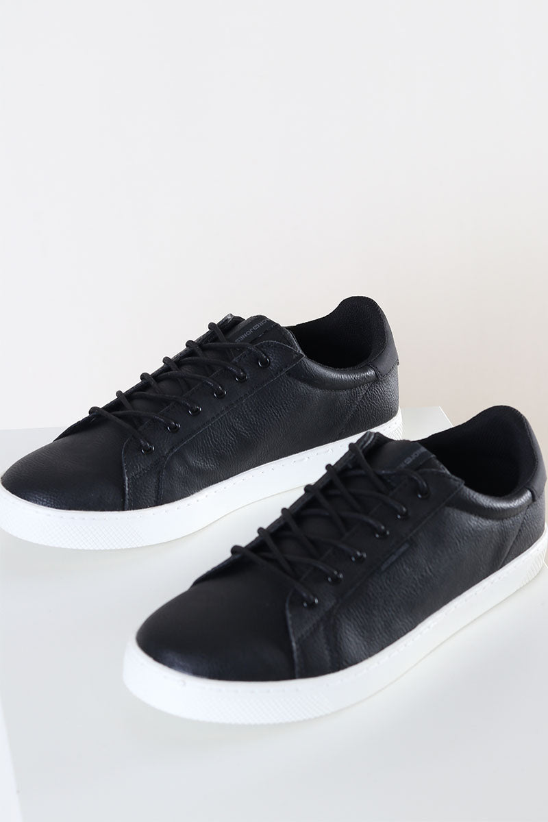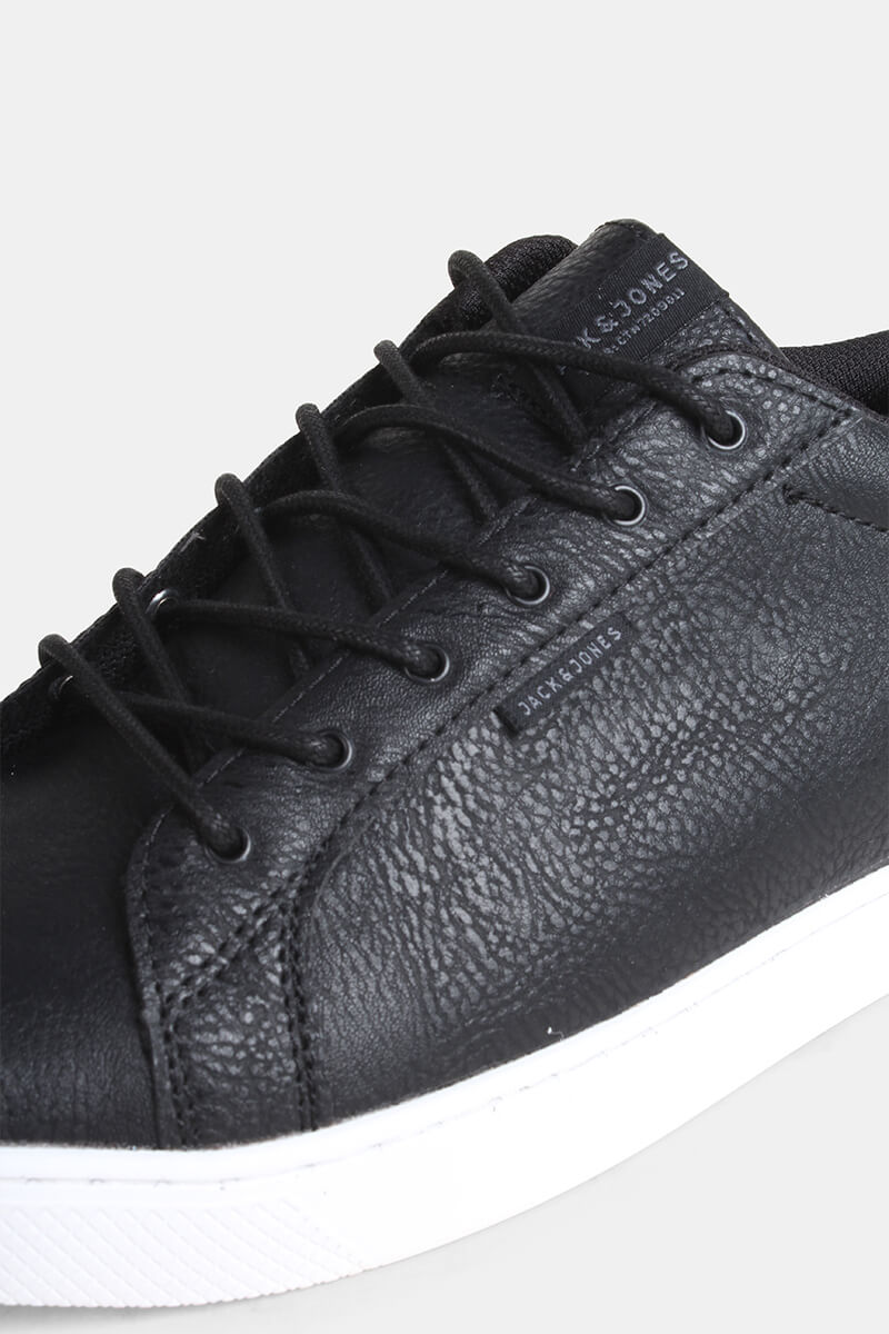 Sneakers från Jack & Jones. Kommer i svart PU läder med struktur samt med vit gummisula. Skorna kommer med runda snörband och på tungan är det ett påsytt Jack & Jones logo. Kvalité: 100% polyuretan. Sula: 100% gummi.