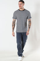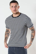 Svart T-shirt från Basic Brand. Randig t-shirt med rund hals och svart ribbad kant. Kvalitet: 100% bomull.