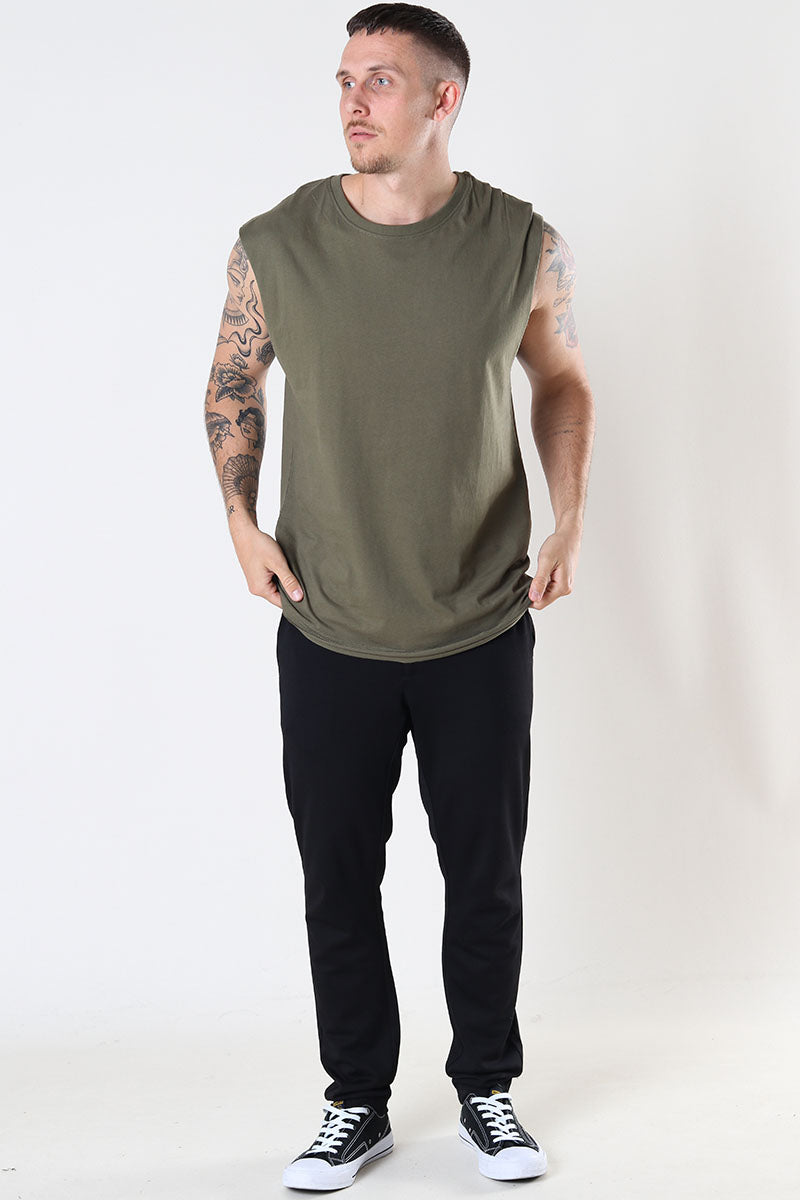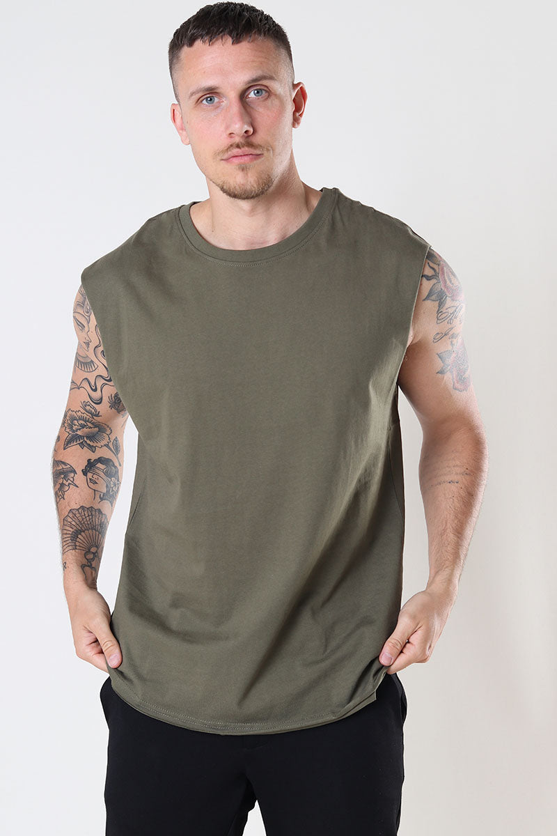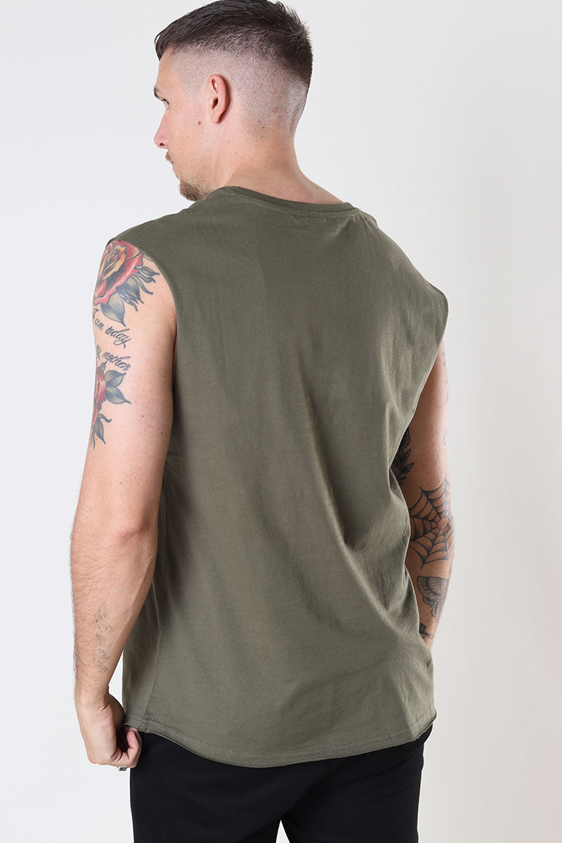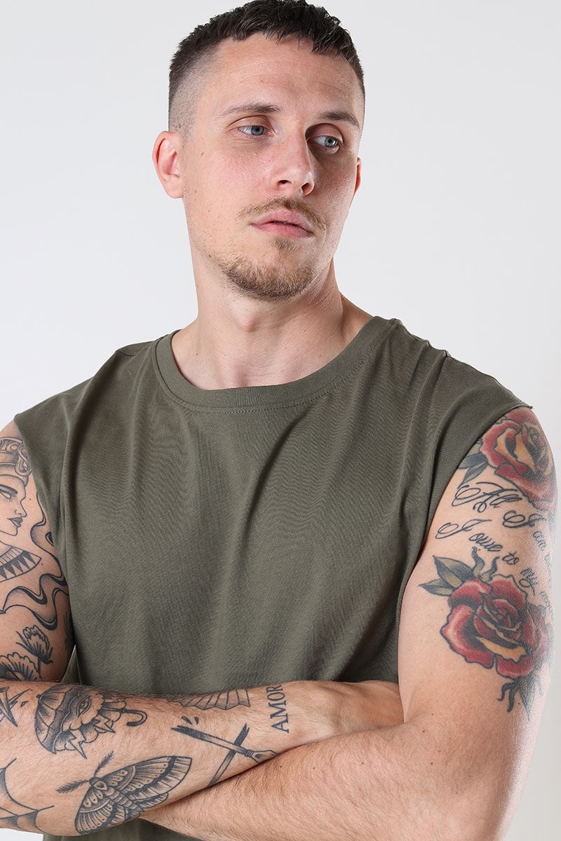 Ärmlös T-shirt från Urban Classics. Olivgrön t-shirt utan ärm. T-shirten har rund hals och avklippt ärm. Kvalitet: 100% bomull.