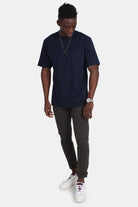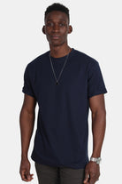Basic tee i färgen Navy blå. Har ett helt plain look. T-shirten har ribbkant vid halsen, samt en rund halsurringning. Kvalitet: 100% bomull. MODELLEN ÄR CA. 1,76 M, VÄGER CA. 75KG OCH ANVÄNDER EN STRL. M