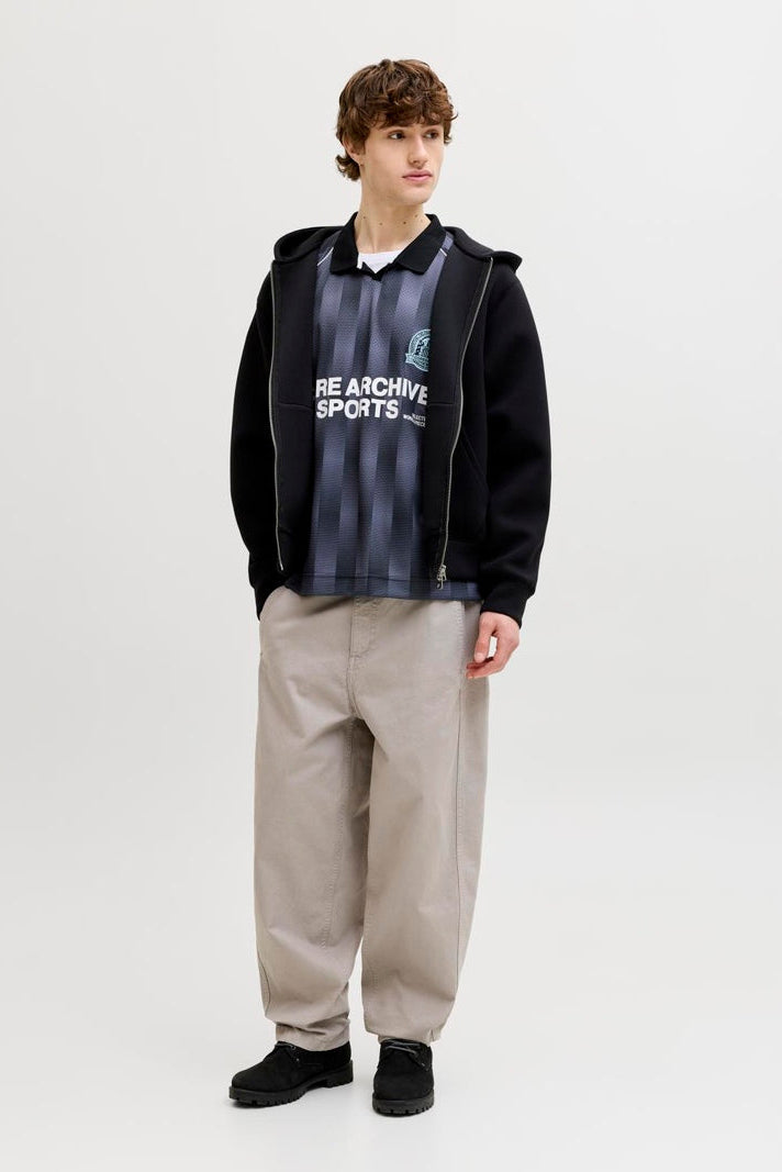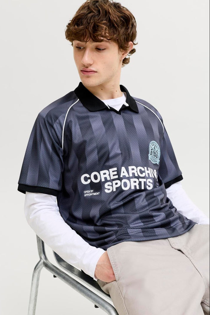 Denna fotbollsinspirerade mesh-t-shirt erbjuder en avslappnad och luftig passform som är perfekt för vardagens stil. Med sin korta ärm och polokrage kombinerar den funktion och stil på ett enkelt sätt, medan det tryckta mönstret över hela plagget ger en snygg och sportig känsla. Materialet andas bra och bidrar till en skön komfort under hela dagen.