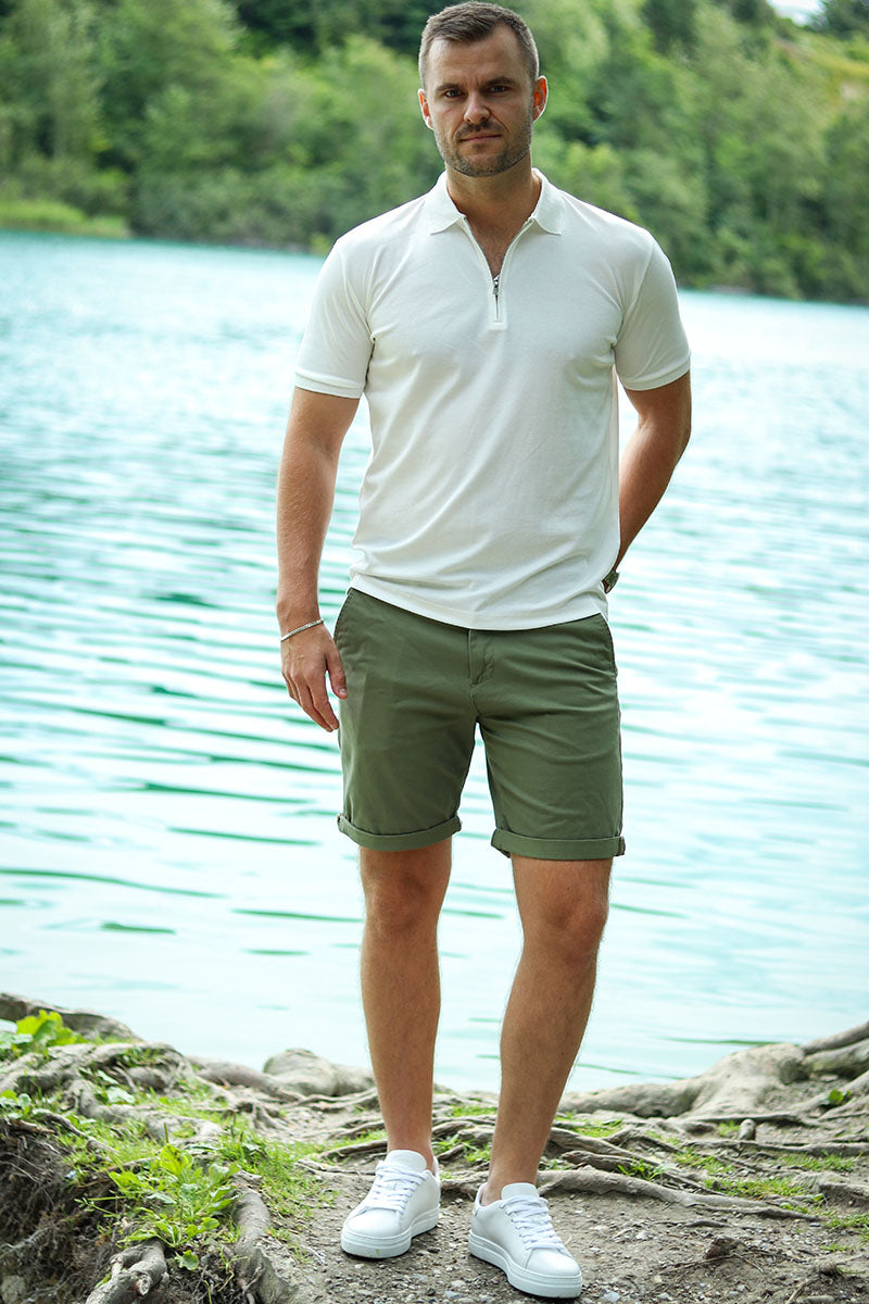 Dessa chinoshorts har en regular fit som ger en avslappnad och bekväm känsla. De är tillverkade med fokus på hållbarhet och innehåller en blandning av organiskt bomull, spårbar bättre bomull och återvunnen bomull vilket gör dem både mjuka och miljövänliga. Färgen är en djup grön nyans kallad Deep lichen green som passar bra till många olika stilar.