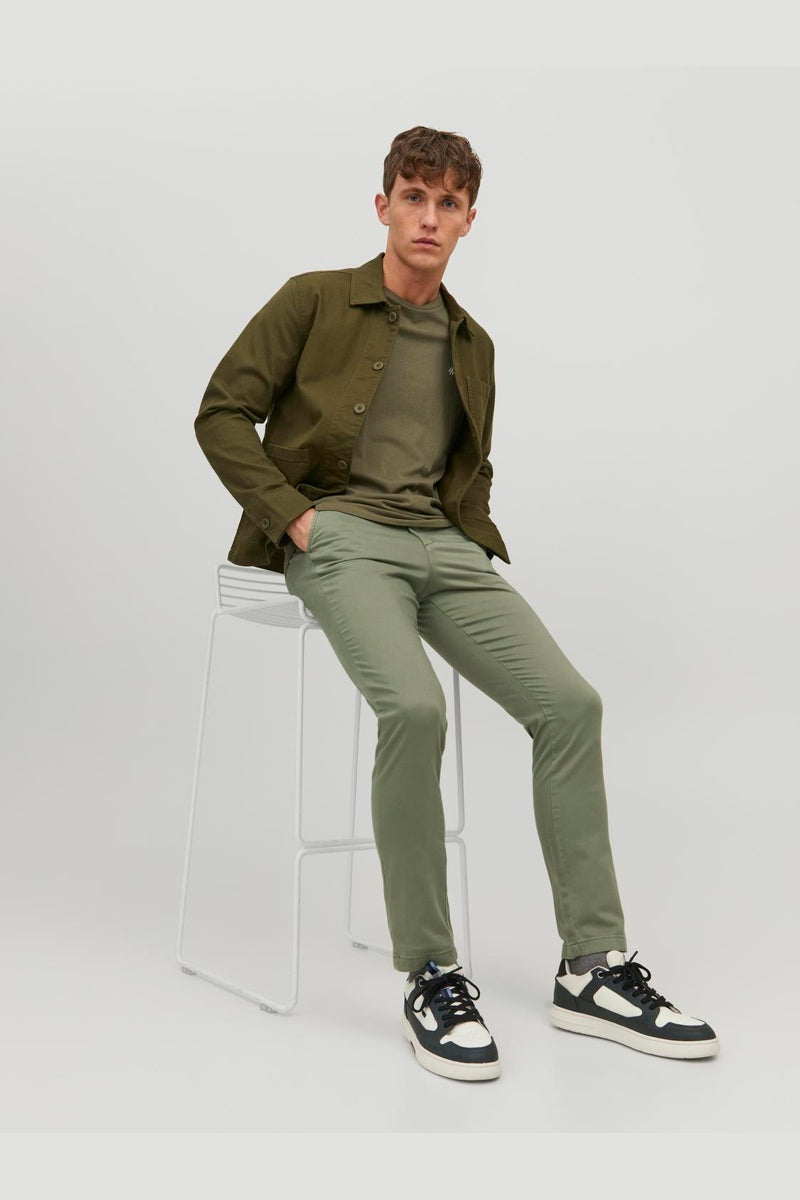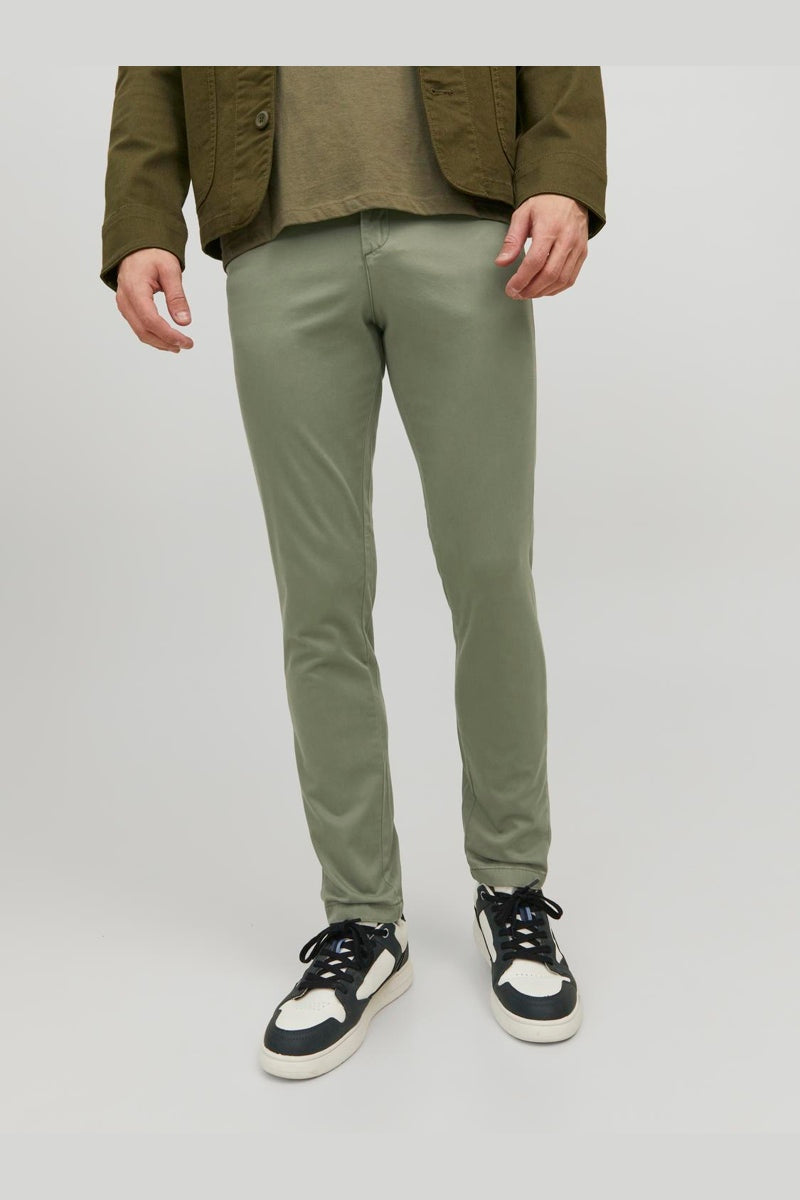 Upptäck en stilren och bekväm chino som passar perfekt för en smart-casual look. Dessa chinos är tillverkade i ett vävt tyg som är både starkt och hållbart utan att töja sig, vilket ger en skarp silhuett med en slim fit och låg midja. Modellen stängs med blixtlås och har praktiska fickor fram och bak, vilket kombinerar funktionalitet med en modern känsla.
