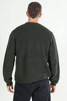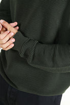 - Den stickade tröjan har ribbade kanter vid fåll, ärmar och krage.