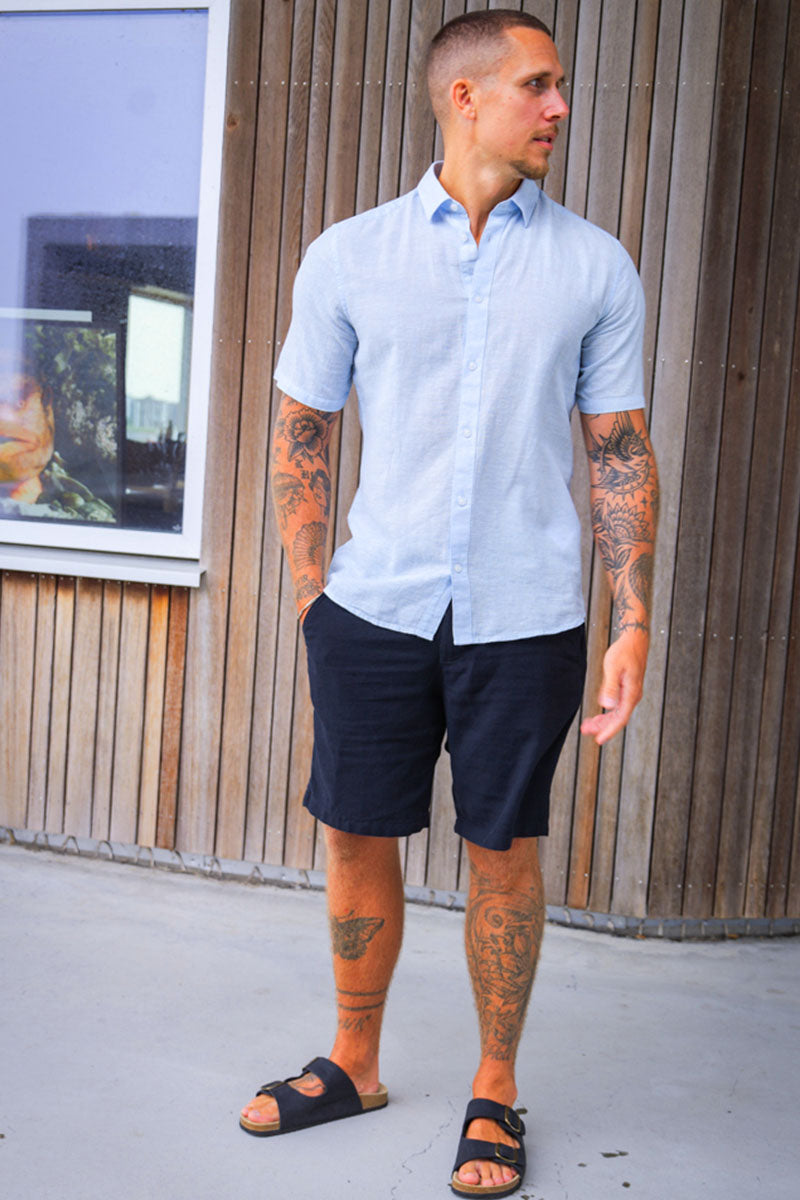 - Ljusblå kortärmad linneskjorta i slim fit