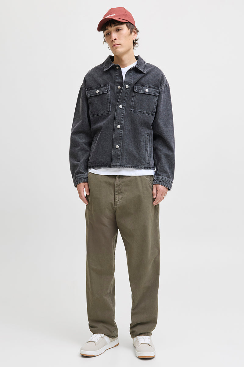 - Byxorna har blixtlås‑gylf samt sneda framfickor