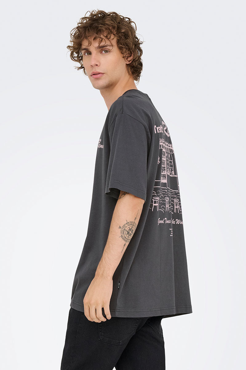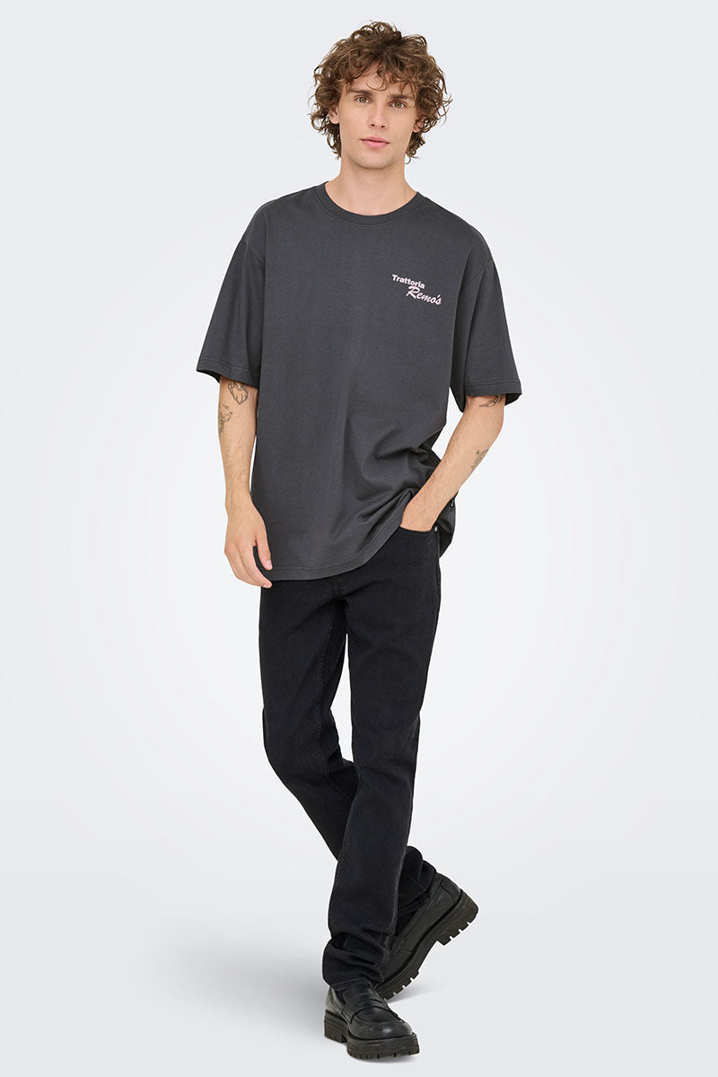 - T‑shirt med stort tryck på ryggen och mindre tryck på bröstet