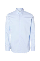 • Skjorta med vanlig krage, rundad fåll och långa ärmar med knäppta manschetter