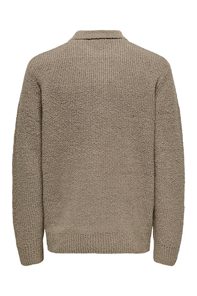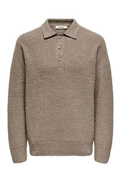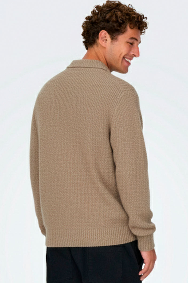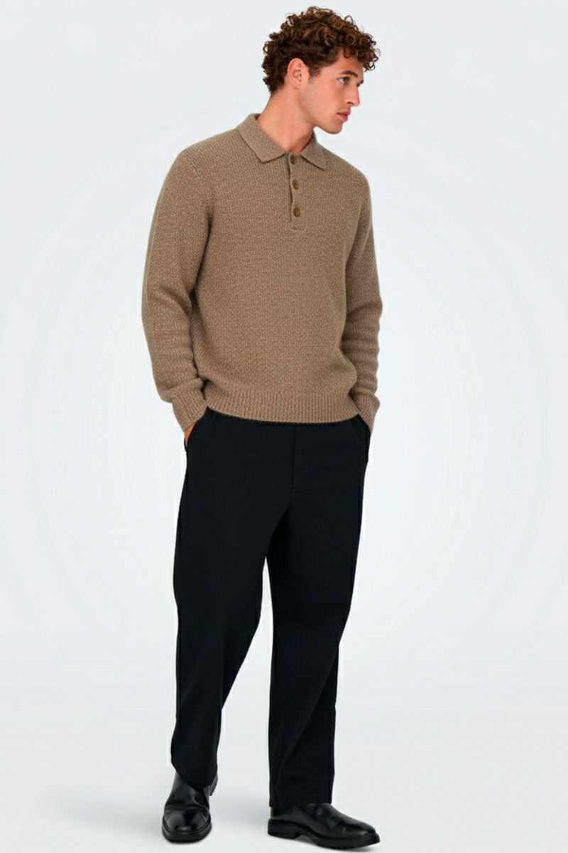 - Tröjan har en stickad krage och 3 knappar upptill. Dessutom har den ribbad kant vid fållen och ärmarna