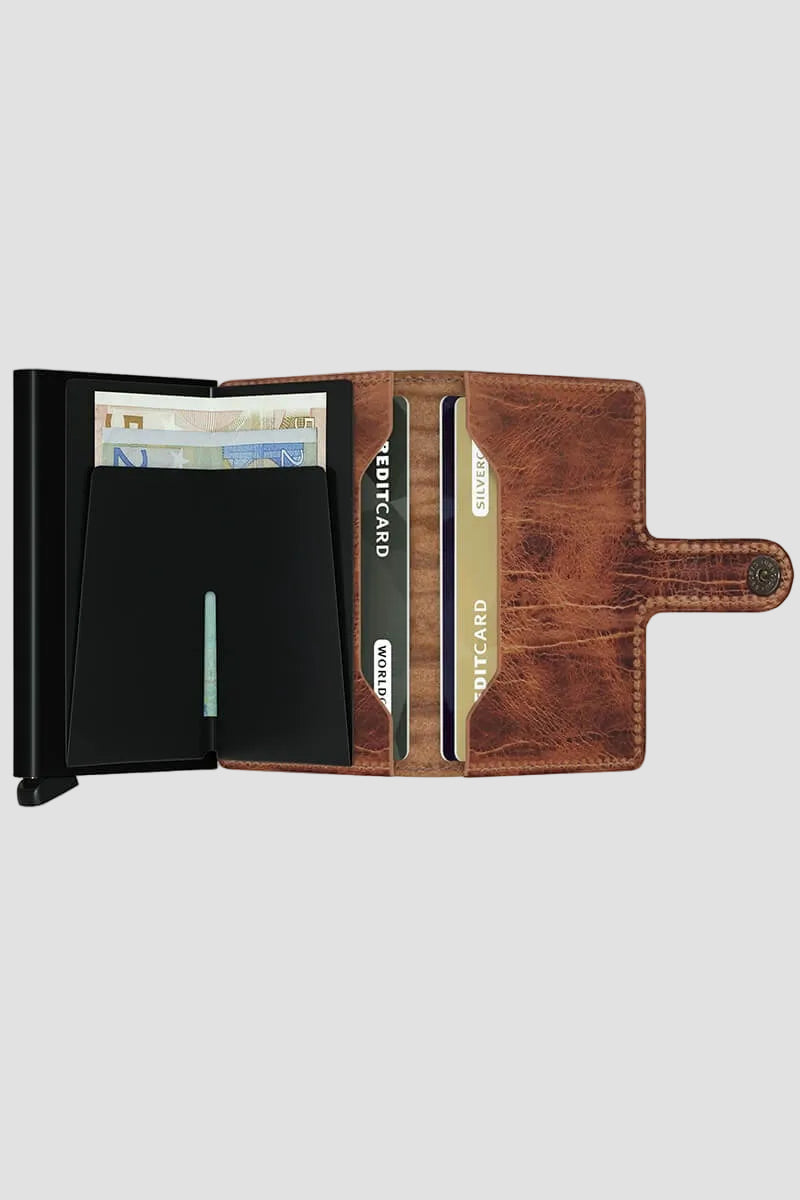 - Korthållaren skyddar mot slitage och RFID‑skanning. Den är tillverkad av aluminium och täckt med vintage läder, vilket ger ett exklusivt uttryck.
